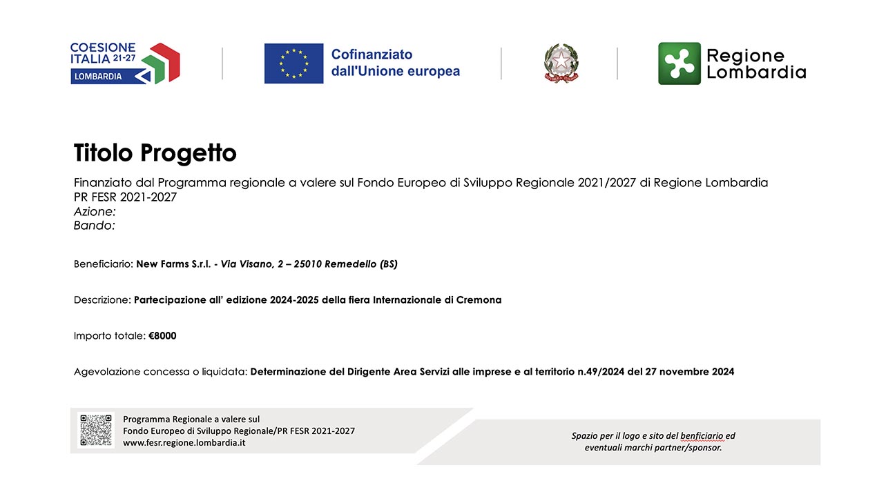 La Società New Farms S.r.l. ha beneficiato del contributo PR FERS 2021-2027 per la partecipazione all’edizione 2024-2025 della Fiera Internazionale Zootecnica di Cremona.